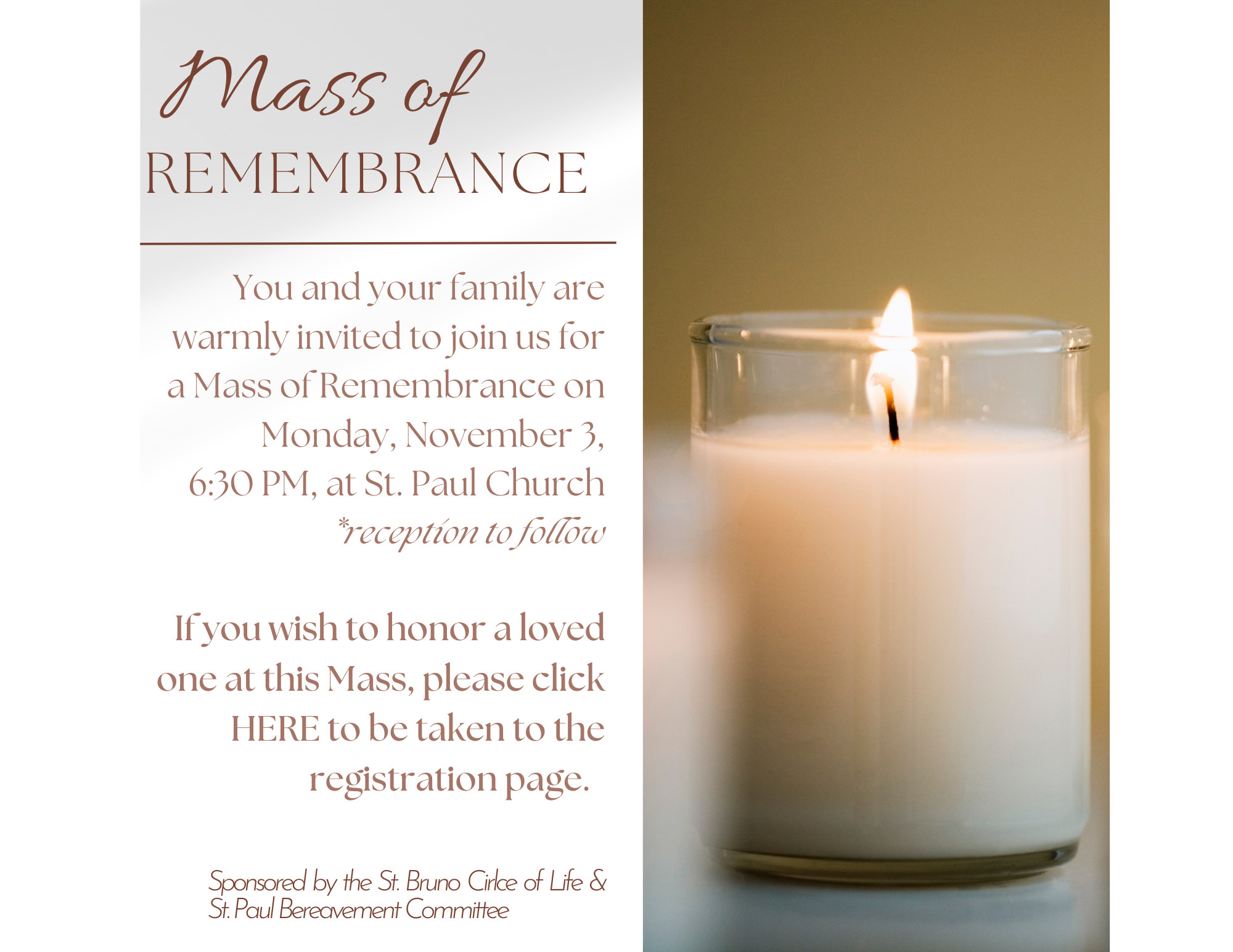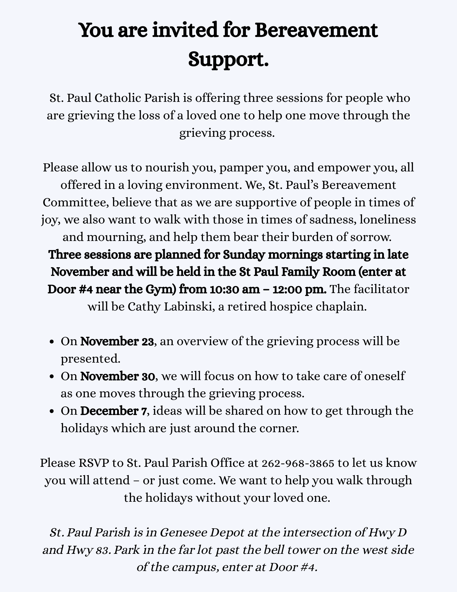 Have you had a loved one die? If you need to talk to someone, please contact our office at 262-965-2332. We will have a member of our St. Bruno Circle of Life Bereavement Ministry reach out to you - we are here to help!